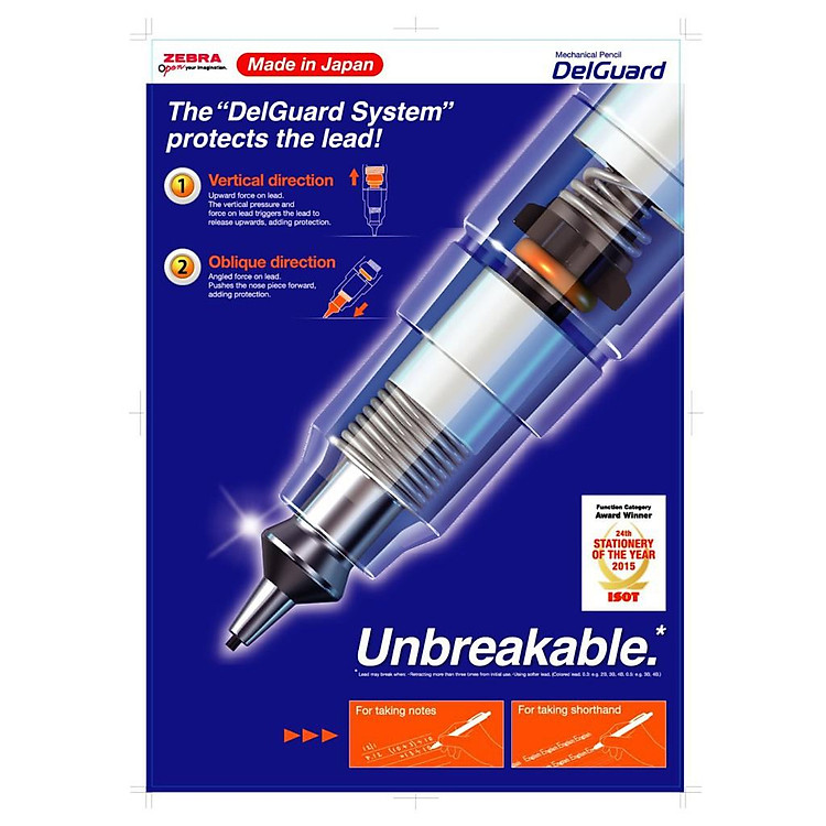– Bút chì bấm của Zebra là cây bút cơ khí mới nhất giúp giải quyết các vấn đề về lõi bị hỏng và lõi bị tắc. Hệ thống DelGuard mới được phát triển bảo vệ lõi khỏi mọi hướng. Trong bút cơ thông thường, đầu bút hỗ trợ ngắt chì khi áp suất đầu áp vào đầu nhiều hơn mức cần thiết.