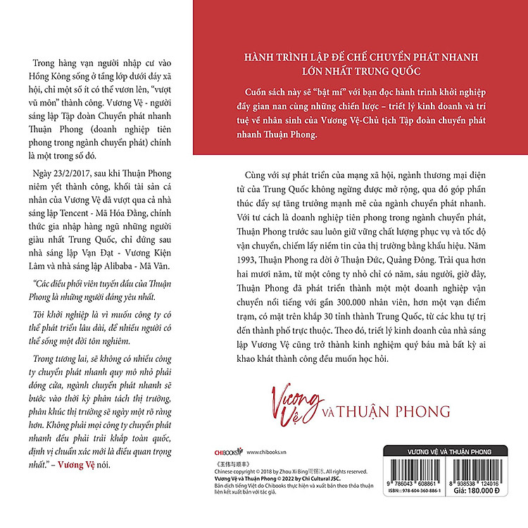 - Nội dung chính: Cuốn sách khám phá hành trình khởi nghiệp và triết lý kinh doanh của Vương Vệ – Chủ tịch Tập đoàn Chuyển phát nhanh Thuận Phong.