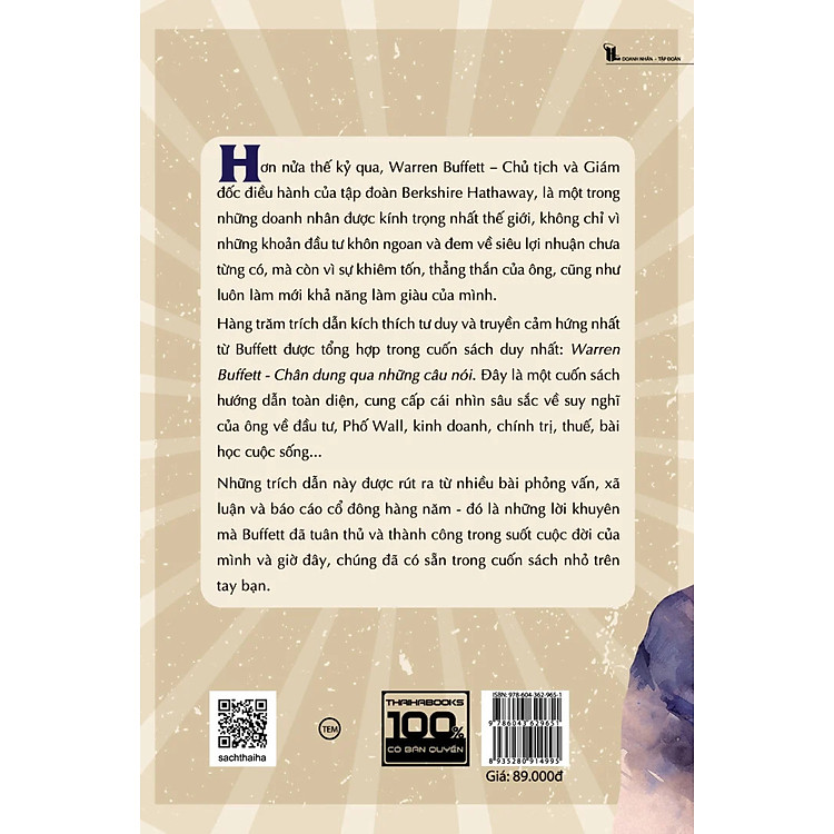 Không chỉ cung cấp kiến thức, “Warren Buffett – Chân Dung Qua Những Câu Nói” còn truyền cảm hứng mạnh mẽ cho độc giả. Đây là lựa chọn tuyệt vời cho những ai muốn tìm nguồn động lực mới. Hãy tham khảo ngay bảng giá bên dưới để mua sách dễ dàng và tiết kiệm hơn.”